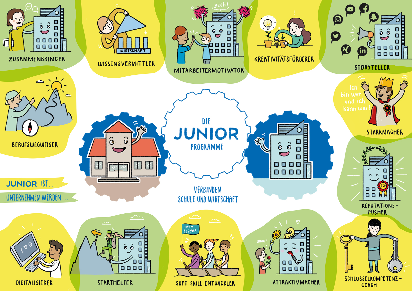 Die Jugendlichen erleben die verschiedenen Facetten der Wirtschafts- und Arbeitswelt und erwerben dabei Schlüsselqualifikationen wie Teamfähigkeit, Eigenverantwortung und Selbstständigkeit.