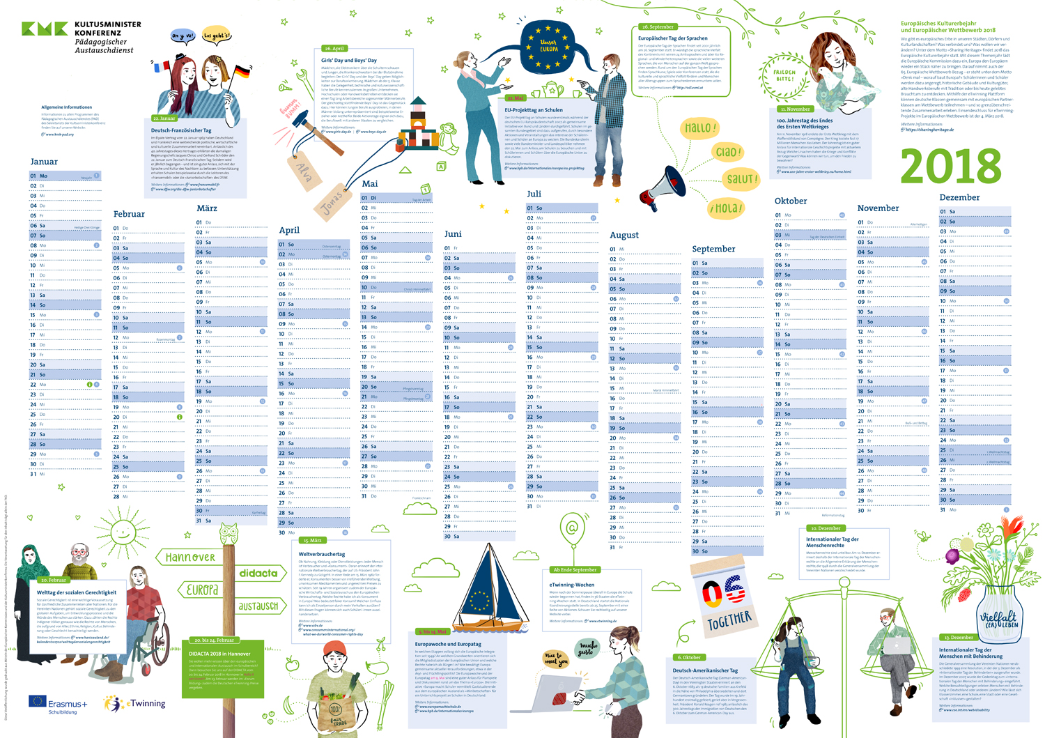 In Kooperation mit der Kölner Agentur DITHO entstand dieser von mir illustrierte Wandkalender als Sonderbeilage des von der Kultusminister-konferenz herausgegebenen Heftes Austausch bildet. Interessenten und Partnern des Pädagogischen Austauschdienstes werden hier spezielle Tage hervorgehoben, die gesellschaftliche, politische, historische und kulturelle Themen im Fokus haben.