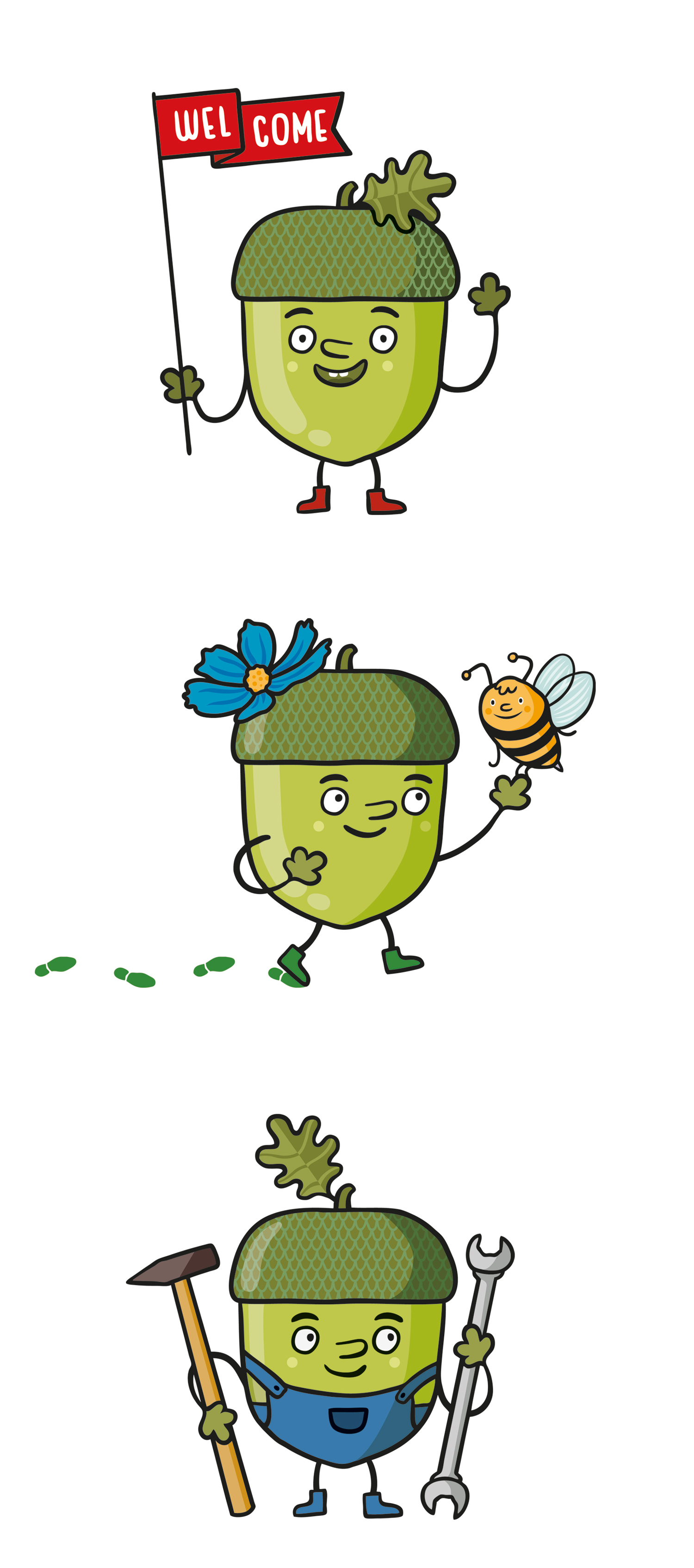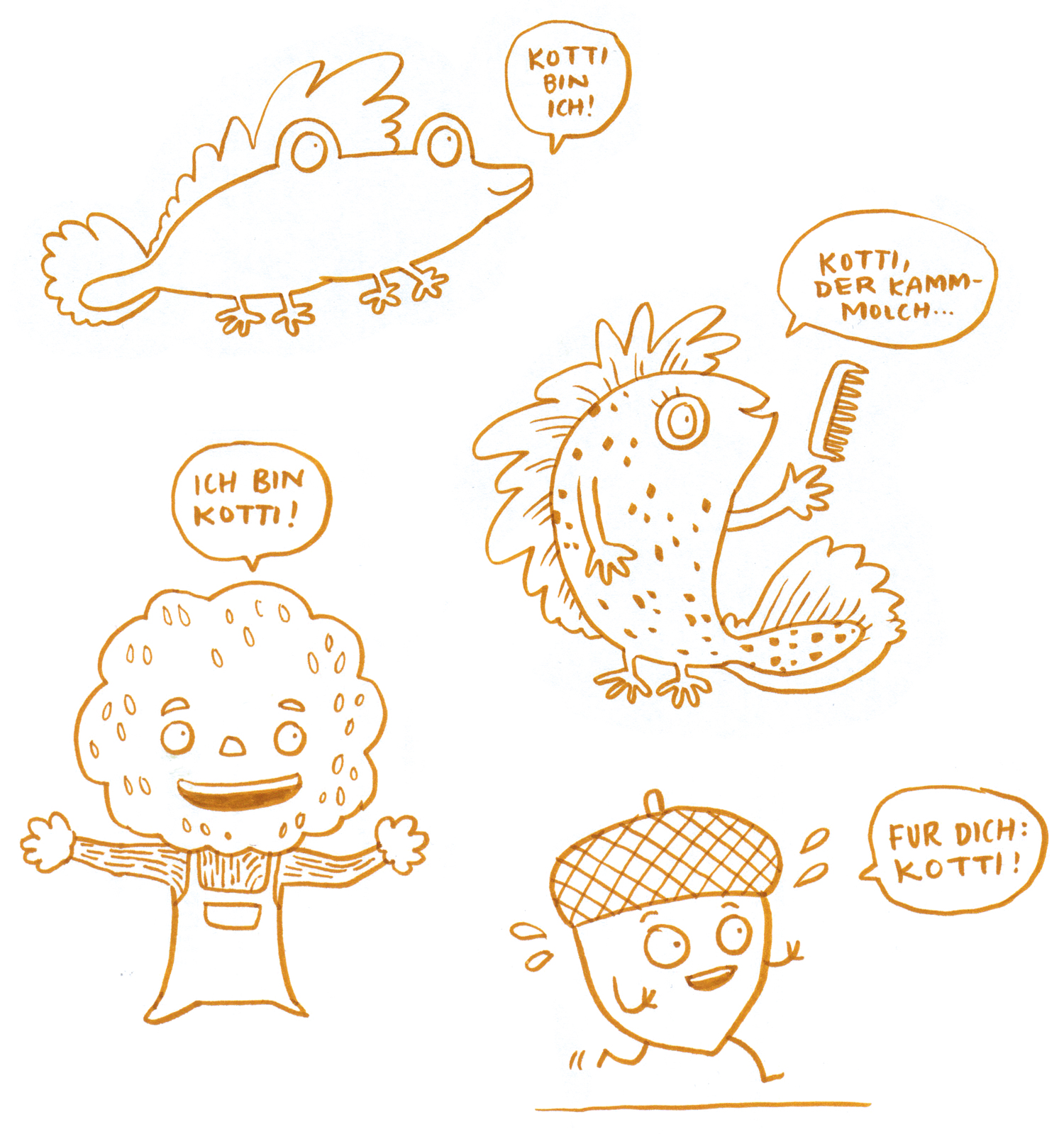 Ideenskizzen: Im ersten Schritt erkundeten wir einige Möglichkeiten inhaltlich passender Charaktere. Da der Campus von einem Eichenwald gesäumt wird, lagen ein Eichenbaum und eine Eichel auf der Hand. Der Kammmolch, der im Biothop des Campusgeländes lebt, war anfangs auch mit im Rennen...