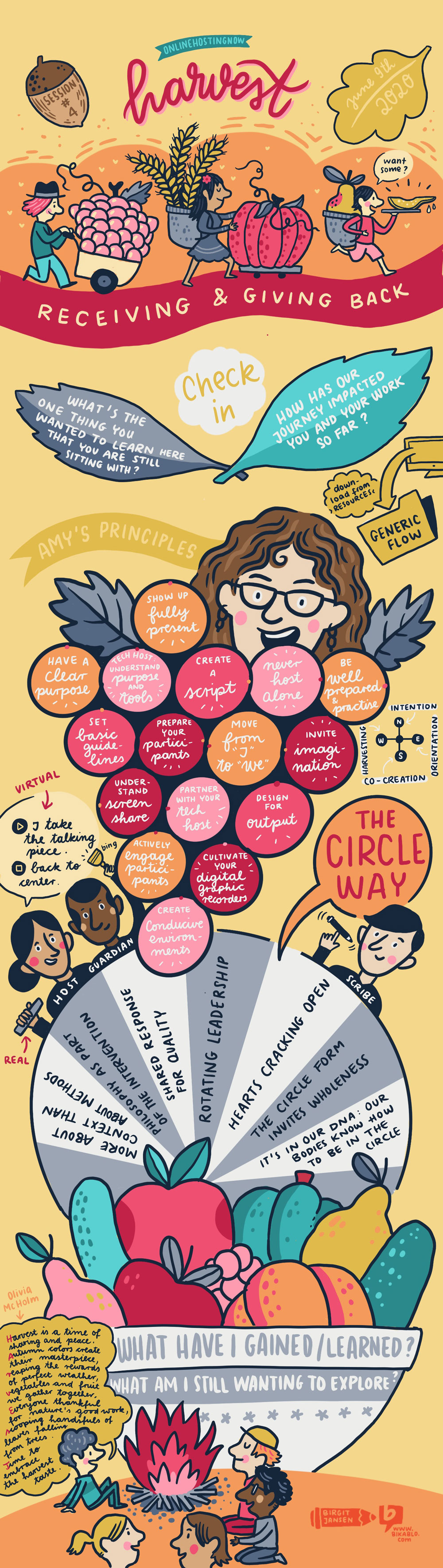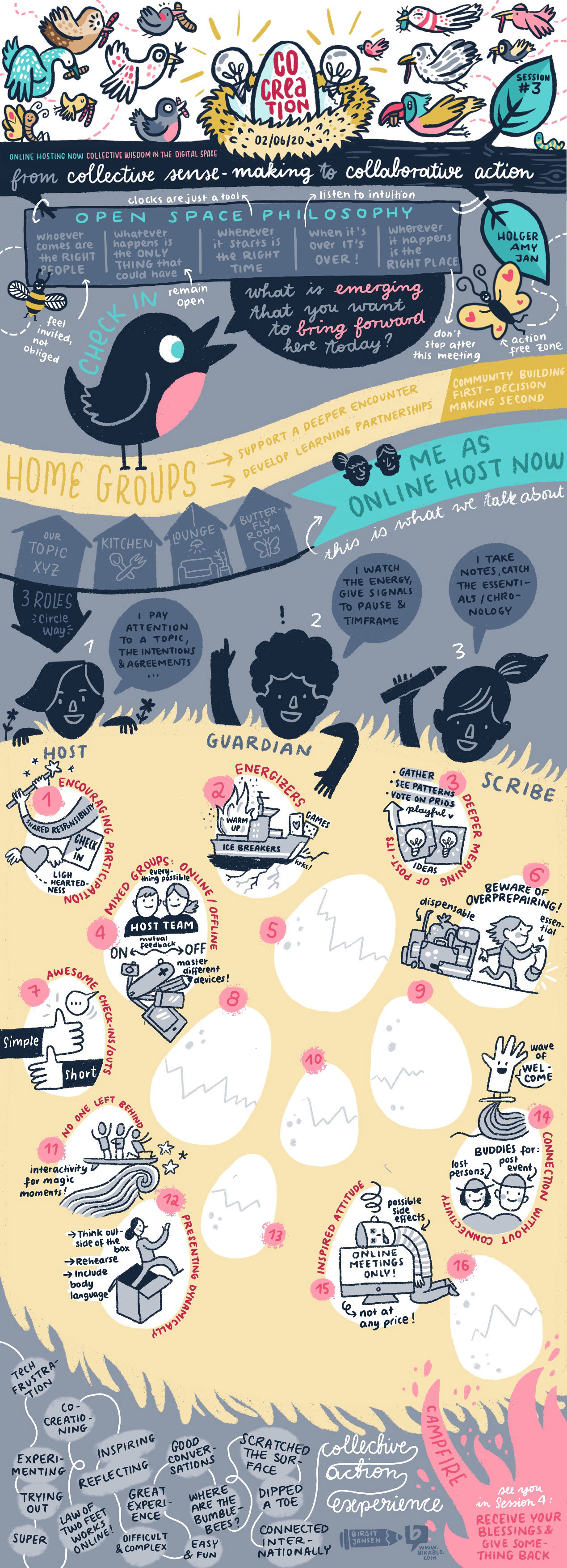 Aufgabe des online Scribing ist es hier, Kernaussagen und essenzielle Fragen aus den Gesprächen herauszuhören und diese in Bilder übersetzt – in dieser Form des Graphic Recordings nicht zu Papier, sondern – aufs iPad zu bringen. Die visuelle Ernte spiegelt am Ende der Session (dank Screensharing) den Teilnehmenden die Besonderheiten des jeweiligen Teilabschnitts der gemeinsamen Lernreise, macht Inhalte nachhaltig erinnerbar und kann als Auftakt für vertiefende Gespräche oder Reflexionen genutzt werden. Das entstandene Bild ergänzt und bereichert die textlichen Aufzeichnungen, die aus den Gesprächen parallel von den Hosts abgeleitet und für die Teilnehmenden aufbereitet wurden.